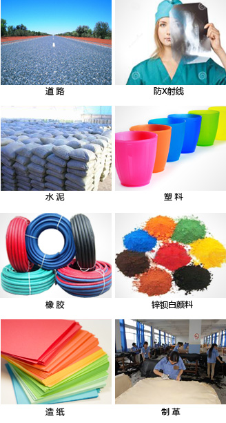用于工业填料中:在油漆工业中,重晶石粉填料可以增加漆膜厚度、强度及耐久性。 在造纸、橡胶、塑料领域,重晶石料能提高橡胶和塑料的硬度、耐磨性及耐老化性; 锌钡白颜料也用于制造白色油漆,在室内使用比铅白、镁白具有更多的优点。